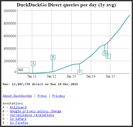 Google had a good 2015. So did Bing, actually (given they now power AOL and had relative success with Windows 10 and the Edge browser). But in 2016, I think our fastest-growing broad, web search engine will be DuckDuckGo, whose growth in 2015 was pretty remarkable, too: