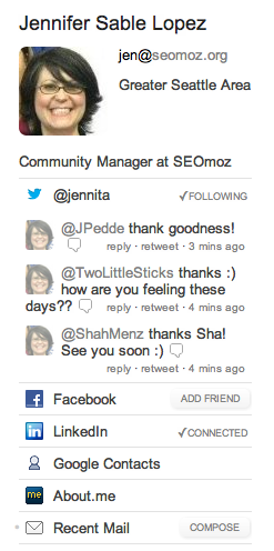 Pro Tip: If you're trying to guess the right email address, start with first name @ domain.com and press tab, if it's correct, their profile will show up on Rapportive. If not, guess again. The folks at Distilled have some clever tricks, as well.