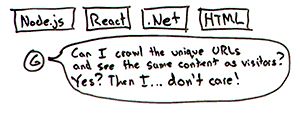 Are you using certain JavaScript libraries like Node or React, one is Facebook, one is Google. If you use Facebook's, does Google give you a hard time about it? No. Facebook might, due to patent issues, but anyway we won't worry about that. .NET or what if you're coding up things in raw HTML still? Just fine. It doesn't matter. If Google can crawl each of these URLs and see the unique content on there and the content that Google sees and the content visitors see is the same, they don't care what's being used under the hood to deliver that to the browser.