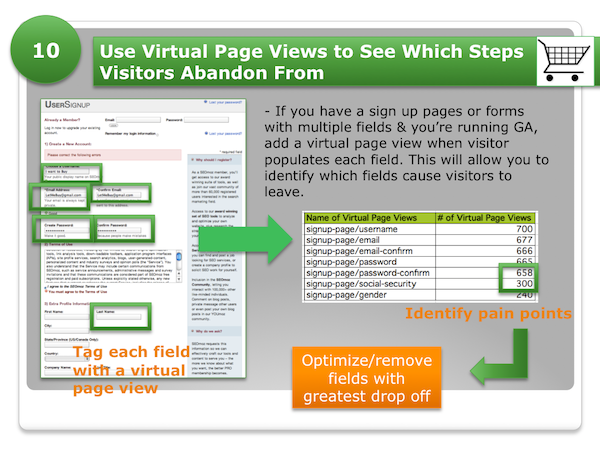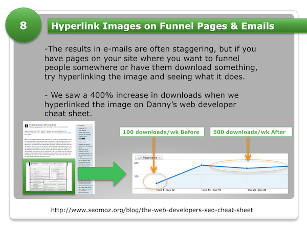 The takeaways from these slides shouldn't be - do exactly what we're doing on your pages - but rather, find a process at your company to identify where your traffic is going, where you are losing customers, and make small conversion rate improvements because, depending on how you monetize your site, making incremental conversion rate improvements could be the most efficient way to hit your revenue goals this year.