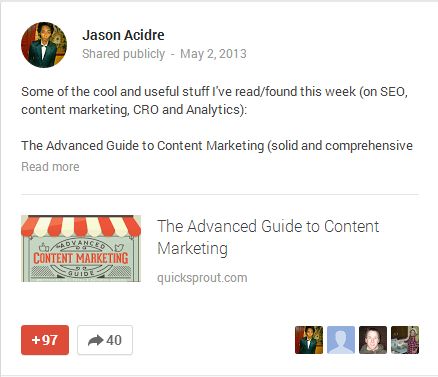 For instance, a few months back, I did a weekly roundup of the blog posts I've read each week on Google+. My first one was shared 40 times within the network, which means 40 Google+ profiles have just linked to the URLs I've shared.