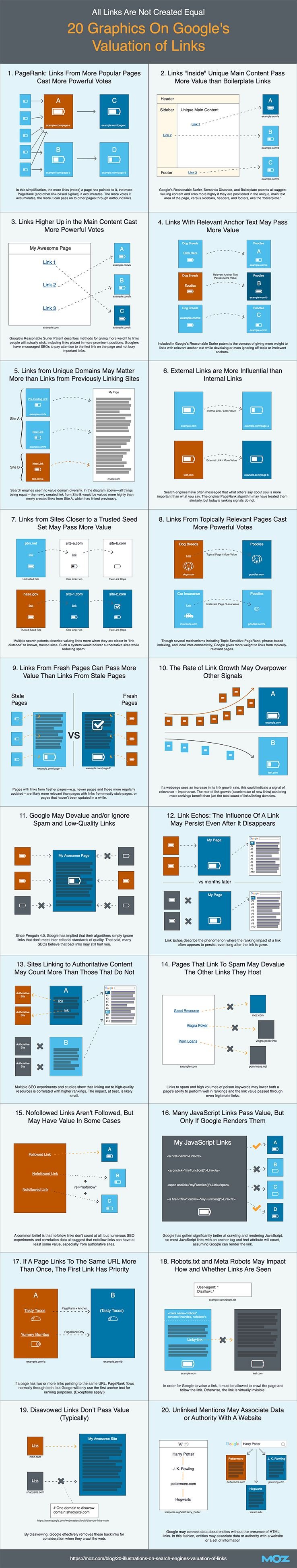 In this post, we'll walk you through 20 principles of link valuation that have been observed and tested by SEOs. In some cases, they have been confirmed by Google, while others have been patented. Please note that these are not hard and fast rules, but principles that interplay with one another. A burst of fresh link can often outweigh powerful links, spam links can blunt the effect of fresh links, etc.