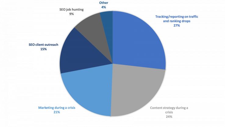 Along those same lines, the most popular topic requested as a result of COVID-19 impacts with 27% of responses was tracking/reporting on traffic and ranking drops. Content and marketing strategies during a crisis came in close second and third, with 24% and 21%, respectively.