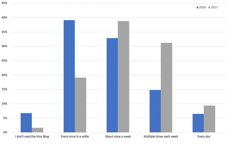 Given the multiple off-blog distribution methods and frequency of prompts to take this year's survey, we saw a sharp increase in "non-reader" responses from 1% in 2017 to 6% in 2020. That said, it's interesting that Moz email and social media subscribers who weren't Moz Blog readers felt motivated to take a survey entitled "Moz Blog Reader Survey". We've taken note of the topics requested from those respondents, in the hopes of encouraging more engagement with the blog.