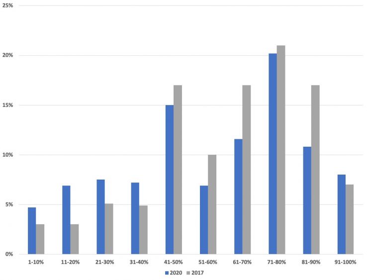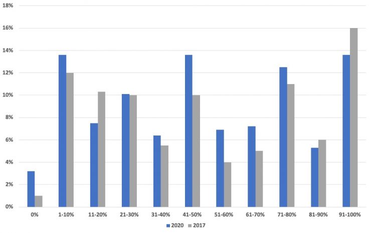 That said, 2020 saw an increase in respondents in the lower percentage brackets of readers who use SEO strategies in their daily work, specifically the 1-10% and 41-50% ranges. This could be due, in part, to the broadening of tasks assigned to SEOs in the marketing industry, as several respondents also mentioned a need to wear multiple hats in their organization.
