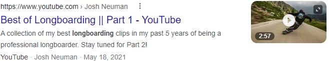 Prior to breaking out video into separate features, Google typically displayed video results as standard results with a screenshot thumbnail. In the past month, Google seems to have revived this format. Here’s an example for the search “longboarding”: