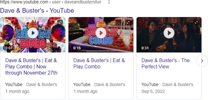 Some videos are displayed in a carousel format, which seems to be common for branded results within YouTube. Here’s an example for the search “Dave and Busters”: