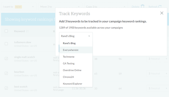 Undoubtedly, our most-requested feature of the summer was the ability to import a list (or selected keywords from a list) over to a campaign to track. The previous export/import system worked, but it was an unnecessary hassle. Today, you can simply use the "I want to" menu, choose "Add XYZ to Campaign," and then select which campaign you want (or create a new one).