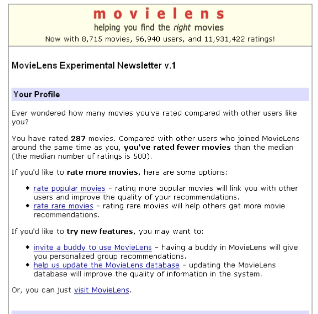A recent study on MovieLens found that “after receiving behavioral information about the median user's total number of movie ratings, users below the median demonstrate a 530 percent increase in the number of monthly movie ratings, while those above the median decrease their ratings by 62 percent”.