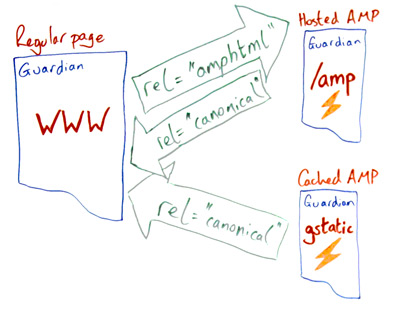 So this is a page on your own domain constructed of this stripped-down form of HTML. So if you want to see this in action, I've referenced the Guardian here. They were one of the first reference partners. You can put /amp on the end of any news story on the Guardian website and see the AMP HTML. It's linked in display with the AMP HTML link in the source code.
