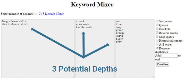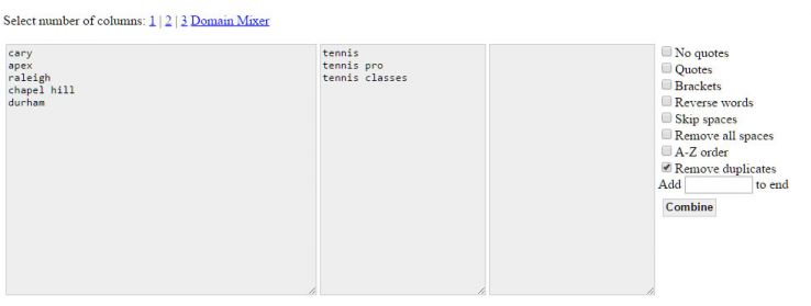 We're going to start by using a hugely useful tool: Keyword Mixer. We start by putting each one of those categories into one of the columns in Keyword Mixer. When we hit "combine," it will create a list of all the keyword combinations of these 3 potential categories.