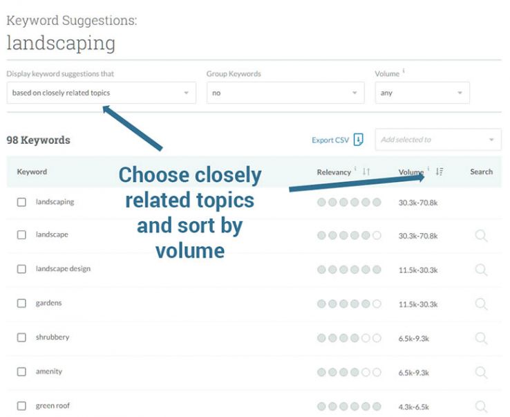 Head on over to Keyword Explorer and drop in your primary keyword like "landscaping" and choose "closely related topics." Finally, sort by "Volume" rather than relevancy, since you're looking for generally related topics, not highly related terms.