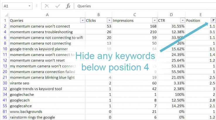 The goal here is to limit ourselves only to keywords that are in a position to drive traffic. Since our data is already sorted by clicks, our most powerful and valuable keywords are at the top.