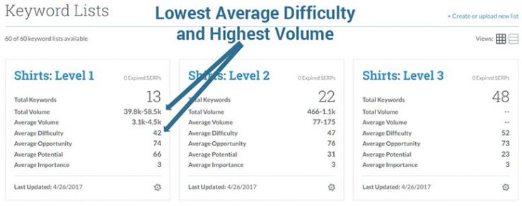 Pro tip: Group your keywords into topic-specific lists, so you can compare the keyword metrics at a topic level as well.