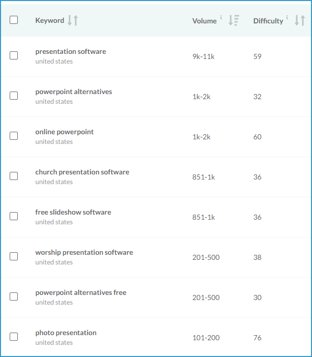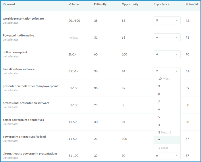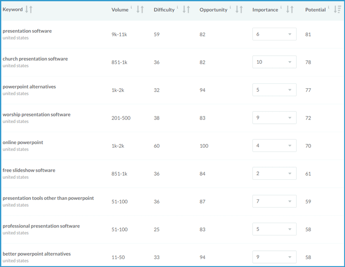 For example, in my list above, I set "free slideshow software" to 2/10, because I know it won't convert particularly well (the word "free" often does not). But, I also know that churches and religious organizations love Haiku Deck and find it hugely valuable, so I've bumped up the importance of "worship presentation software" to 9/10.