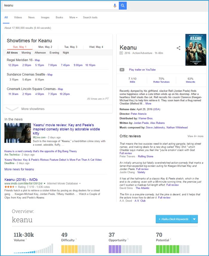 The search above for "Keanu" has an instant answer, knowledge graph, news results, and images (further down). Hence, its Organic CTR Score is a measly 37/100, which means our model estimates ~37% of clicks go to the organic results.
