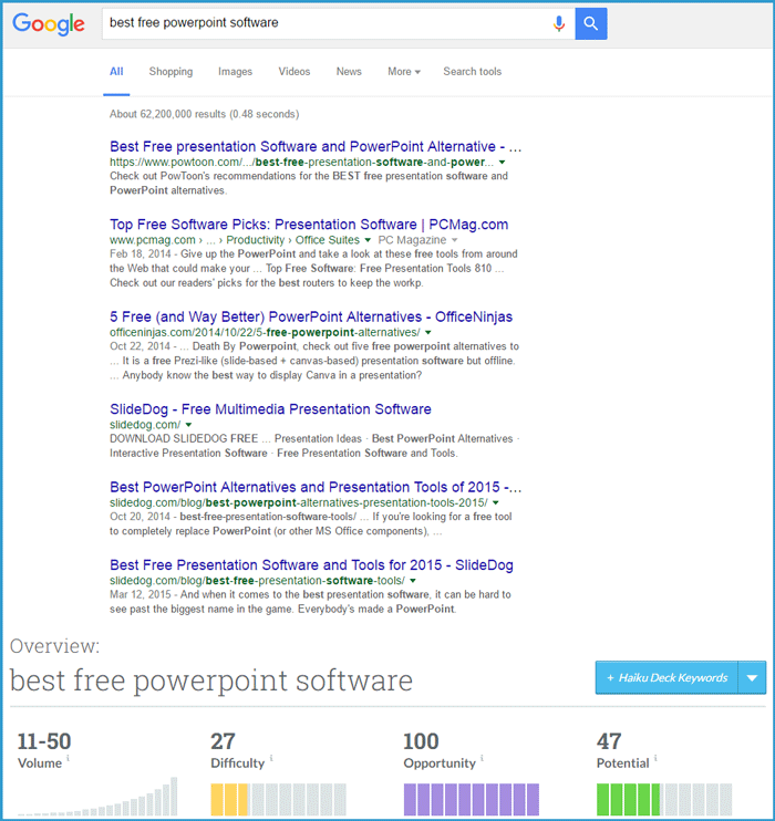 As you can see from one of my lists above (for Haiku Deck, whose board I joined this year), the difficulty ranges are considerably higher than in the past, and more representative of how relatively hard it would be to rank in the organic results for each of the queries.