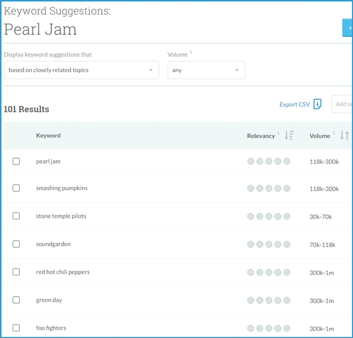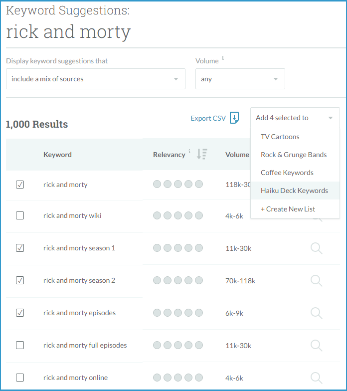 Keyword Explorer is built around the idea that, starting from a single keyword search, you can identify suggestions that match your campaign's goals and include them in your list until you've got a robust, comprehensive set of queries to target.
