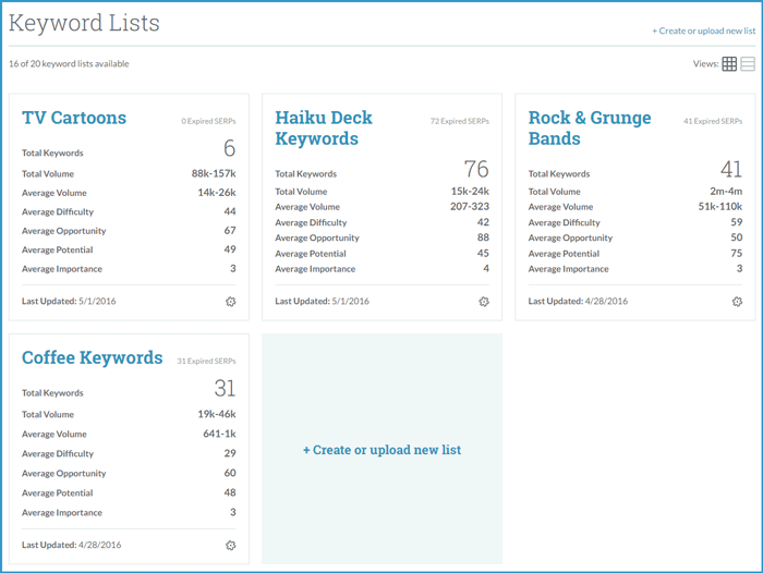 Once you've added keywords to a list, you can go to the lists page to see and compare your sets of keywords: