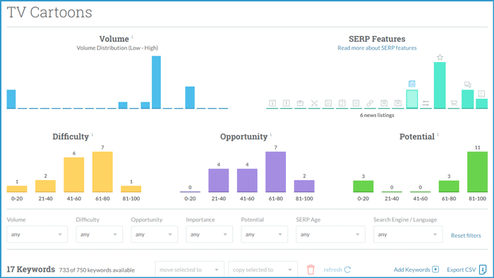 Each individual list will show you the distribution of metrics and data about the keywords in it via these helpful graphs: