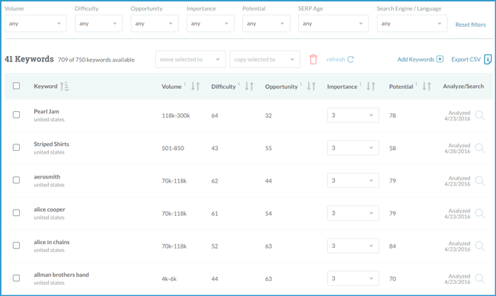After you add keywords to a list, you'll see the Importance score is, by default, set to 3/10. We chose this number to make it easy to increase a keyword's importance by 3X and easy to bring it down to 1/3rd. As you modify the importance value, overall Keyword Priority (below) will change, and you can re-sort your list based on the inputs you've given.