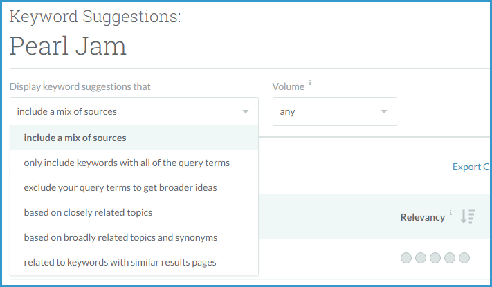 - This filter will show only suggestions that include all of the terms you’ve entered in the query. For example, if you entered “mustache wax” this filter would only show suggestions that contain both the word “mustache” and the word “wax.”