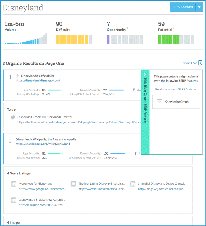 No keyword research tool would be complete without a massive database of search terms and phrases, and Keyword Explorer has just that. We started with a raw index of over 2 billion English keywords, then whittled that down to the ~500 million highest-quality ones (we collapsed lots of odd suggestions we found via iterative crawls of AdWords, autosuggest, related searches, Wikipedia titles, topic modeling extractions, SERPscape — via our acquisition last year — and more) into those we felt relatively confident had real volume).