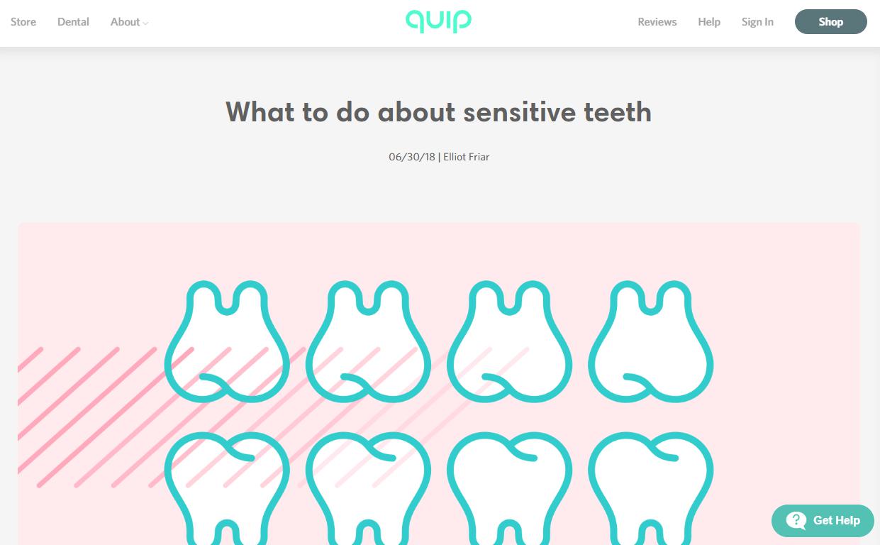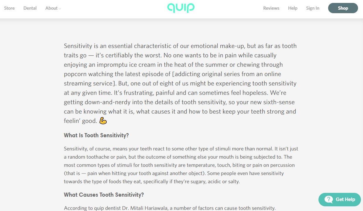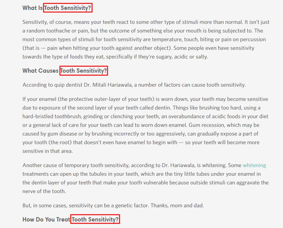 Also, a quick takeaway I had was that Quip’s page does not lead off with a definition of sensitive teeth or tooth sensitivity. We learned from Colgate’s page that quickly defining the term (sensitive teeth) and the associated symptoms could help the page rank better.