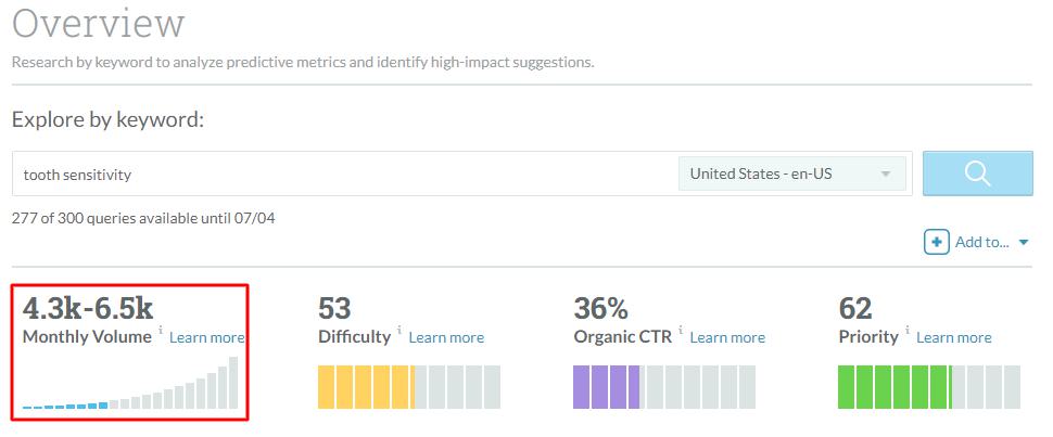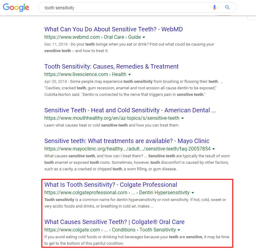 However, this should be a secondary opportunity to [sensitive teeth] and should be mixed in to the copy on the page, but not the focal point. Also, the page one results for [tooth sensitivity] are largely the same as those for [sensitive teeth], including Colgate’s page: