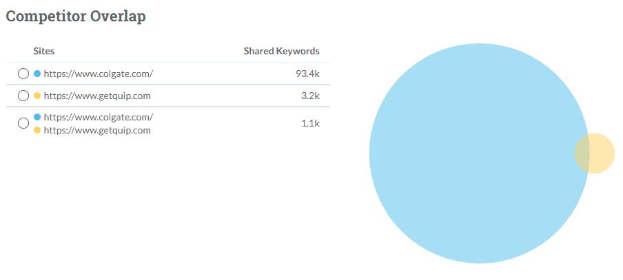 Another source for keyword opportunities and inspiration are your competitors. For Quip, one of its strongest competitors is Colgate, a household name brand. Moz demonstrates the difference in market position with its "Competitor Overlap" tool:
