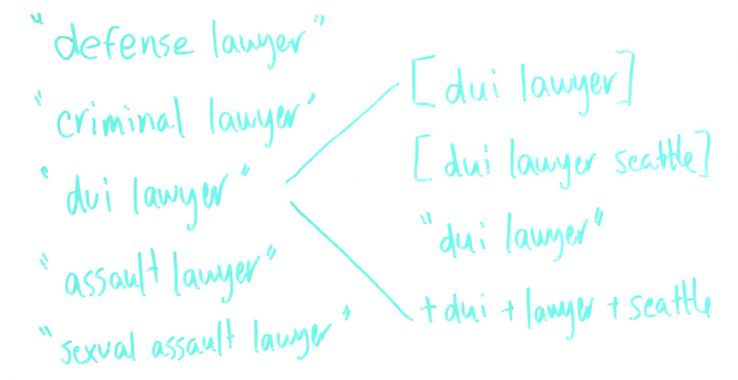 Then exact match is what's in the brackets here, and that is just those words and nothing else. If I have [dui lawyer], this keyword, if I didn't have [dui lawyer seattle], this keyword would not trigger if somebody searches [dui lawyer seattle]. That's as specific as possible. You really want to try that for your most competitive keywords.