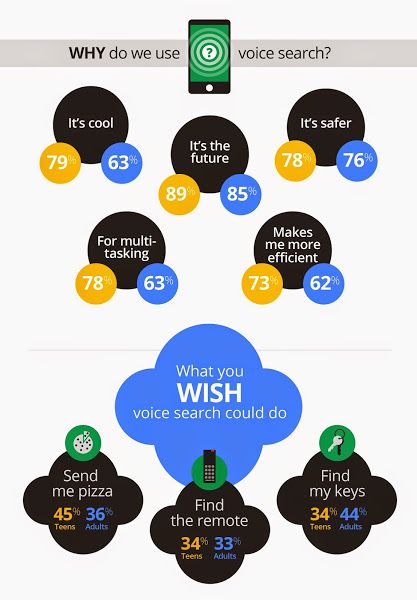 These two studies show increases in usage of voice search on a smartphone. The trend in this direction, in my opinion, will be rapidly accelerated by the new types of Internet-connected devices. Most of these devices will have no keyboard for input. For example, if you are wearing a smartwatch, or interacting with your refrigerator, voice-driven interaction will pretty much be your only option for most functions.
