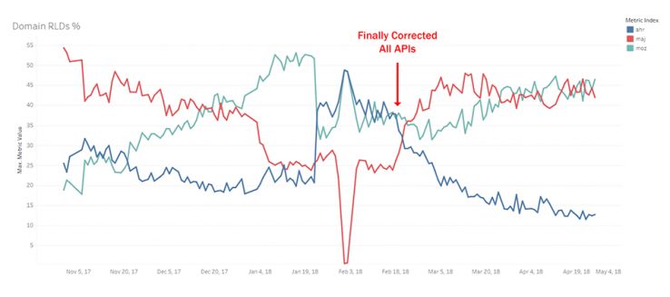 OK, this one took me a while to get just right. In the middle of this graph, I corrected an important error where I was looking at domains only for the root domain on Ahrefs rather than the root domain and all subdomains. This was unfair to Ahrefs until I finally got everything corrected in February. Since then, Moz has been aggressively growing its index, Majestic has picked up LRD counts through the previously discussed network but steadied out, and Ahrefs has remained relatively steady in size. Because of the "adversarial" nature of these metrics, it gives the false appearance that Ahrefs is dropping dramatically. They aren't. They are still huge, and so is Majestic. The real takeaway is directional: Moz is growing dramatically relative to their networks. As of writing this post, Moz is winning.