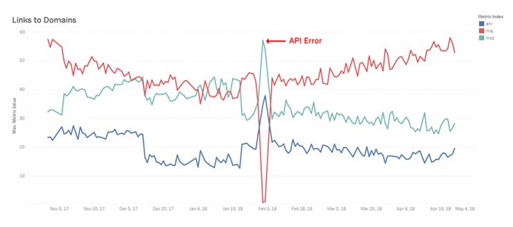This metric was not kind to me, as I found a terrible mistake early on. (For the other techies reading this, I was storing backlink counts as INT(11) rather than BIGINT, which caused lots of ties for big domains when they were larger than the maximum number size because the database defaults to same highest number.) Nevertheless, Majestic has been stealing the show on this metric for a little while, although the story is deeper than that. Their dominance is such an outlier that it needs to be explained.