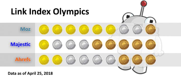 Alright, so we've just spent a lot of time delving into these individual metrics, so I think it's probably worth it to put these things into an easy-to-understand context. Let's pretend for a moment that this is the Link Index Olympics, and no matter how much you win or lose by, it determines whether you receive a gold, bronze or silver medal. I'm writing this on Wednesday, April 25th. Let's see how things play out if the Olympics happened today: