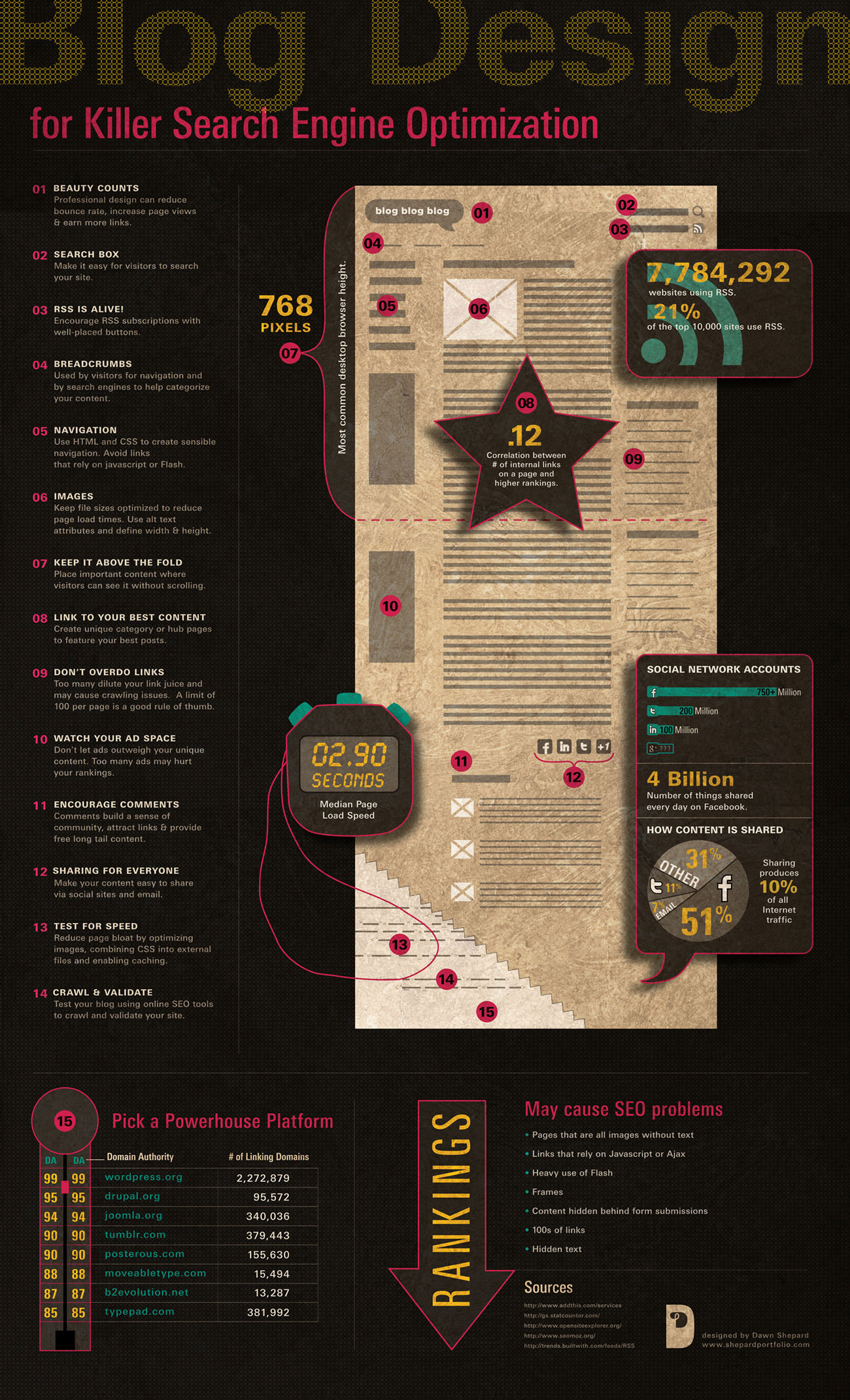 As Blogpulse reports over 165 million identified blogs on the internet, it's safe to say that very few are "done right." I asked my wife, a talented graphic designer, if she would help me develop my personal blog. Her effort developed into this infographic combining SEO and blog design. You probably know someone with a blog who can benefit from this information. Bookmark it and use it as a reference. It presents classic fundamentals as well as tips based on cutting edge research.