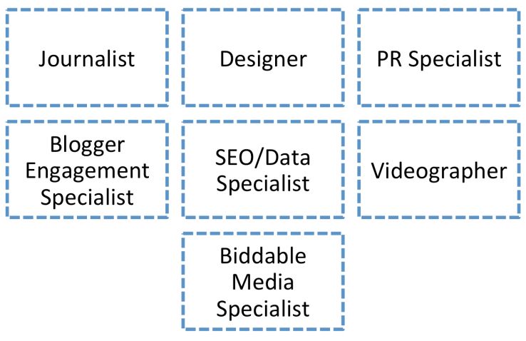 In this scenario, we're ideally looking for multidiscipline people. In an ideal world, your journalist will be able to write and PR their written work, leaving you with the possibility of also including someone to focus on paid promotion across search, social, and native.