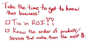 Lastly, just really take the time to get to know someone's business. It just shows that you care, and you're able to prioritize what it is that you can deliver based on where they make the most money off of the products or services that they offer. That helps you tie in the ROI of the things that you can accomplish.