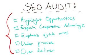 You're going to do an audit, and something that I have always suggested is that instead of highlighting the things that the potential client is doing wrong, or screwed up, is to really highlight those opportunities. Start to get them excited about what it is that their site is capable of and that you could help them with. I think that sheds a really positive light and moves you in the right direction.