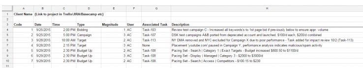 Keeping your test tracking connected to and aligned with your project management tools is always wise. There are myriad project management software tools out there, but I favor agile PM for SEM applications—Trello, Jira, Mingle, Basecamp, and more are all useful. The key here is really that your activity and test logs are easily available wherever you keep project resources, and linked to from whatever cards or items are associated to a particular test. For example, if you have a task card titled “Client-128: A/B Ad Test For {Campaign>Ad Group}”, note “per task Client-128” in your activity log and link directly to that card if your tool permits it. You can also link to the activity log from the card or a project resource file if you’re using a cloud sheet, as in Google Docs Sheets.