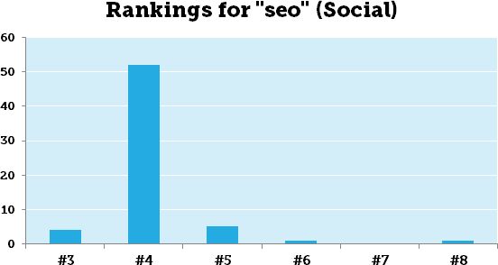 As of this writing, I was showing moz.rainyclouds.online in the #4 spot, so I called in some help via social media. I asked people to do a logged-in (personalized) search for “seo” and report back where they found moz.rainyclouds.online. I removed data from non-US participants, which left 63 rankings (36 from Twitter, and 27 from Facebook). The reported rankings ranged from #3 to #8, with an average of 4.11. These rankings were reported from across the US, and only two participants reported rankings at #6 or below. Here’s the breakdown of the raw data: