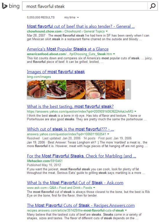 That more sophisticated model might be better illustrated with this query for " most flavorful steak" (also Google US, non-personalized, non-geo-biased):