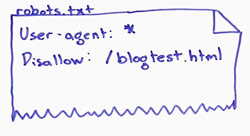 What if, for example, we take a page like "blogtest.html" on our domain and we say "all user agents, you are not allowed to crawl blogtest.html. Okay—that's a good way to keep that page away from being crawled, but just because something is not crawled doesn't necessarily mean it won't be in the search results.