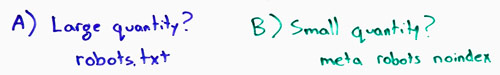Do NOT, however, disallow those in robots.txt—many, many folks make this mistake. What happens if you disallow crawling on those, Google can't see the noindex. They don't know that they can follow it. Granted, as we talked about before, sometimes Google doesn't obey the robots.txt, but you can't rely on that behavior. Trust that the disallow in robots.txt will prevent them from crawling. So I would say, the meta robots "noindex, follow" is the way to do this.