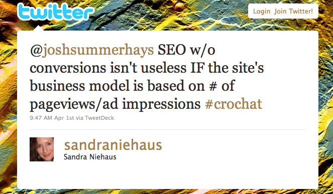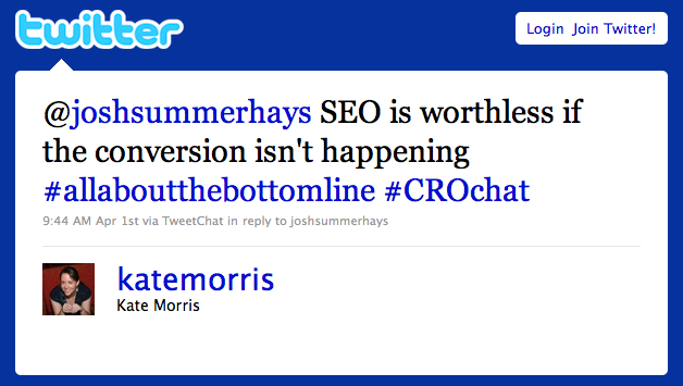 Now, SEO (onsite and general link building) alone is not going to produce immediate results in most cases. It takes time, and much of the work in SEO is very backend code based. While a good SEO knows to balance focus on search engines and users, there are still plenty of sites out there that are missing the point that if the site isn't converting, the site/page optimization was a waste. Which led to this statement during CROchat:
