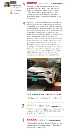 In the above example, the customer has handled their review in four separate updates spanning several days. If you look at the stars, they went from high to low to high again. It’s akin to live updates from a sporting event, and that honestly surprised me to see.