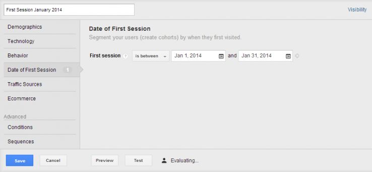 Even though date of first session isn't available as a dimension in reports, it can be used as a criteria for custom segments. This allows us to start building a data set for how many visitors who made their first visit in a given period have returned since.