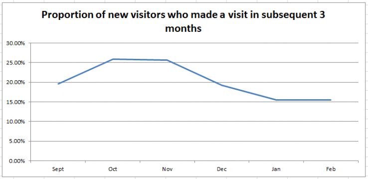 In Distilled's case, I chose 3 months as a sensible period within which I would expect the vast majority of loyal customers to visit the site at least once. Unfortunately, due to the 90-day limit on time periods for this segment, this required adding together the totals for two shorter periods. I was then able to compare the number of new visitors in each month with how many of those new visitors showed up again in the subsequent 3 months: