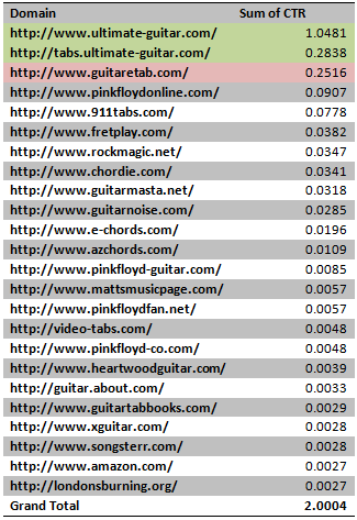 ...what if, instead of restricting myself to a single SERP, I was to aggregate data from multiple searches and sum the click-through rate for each domain across these searches? Searches for "the clash guitar tabs" and "pink floyd guitar tabs" are listed below, one atop the other. I've highlighted www.ultimate-guitar.com and www.guitaretab.com for reference: