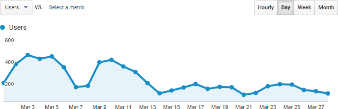 Using Google Analytics, let's consider some ways we can validate a traffic drop. Here's four weeks of GA data (March 1-28) for a site which was seriously impacted by COVID-19: